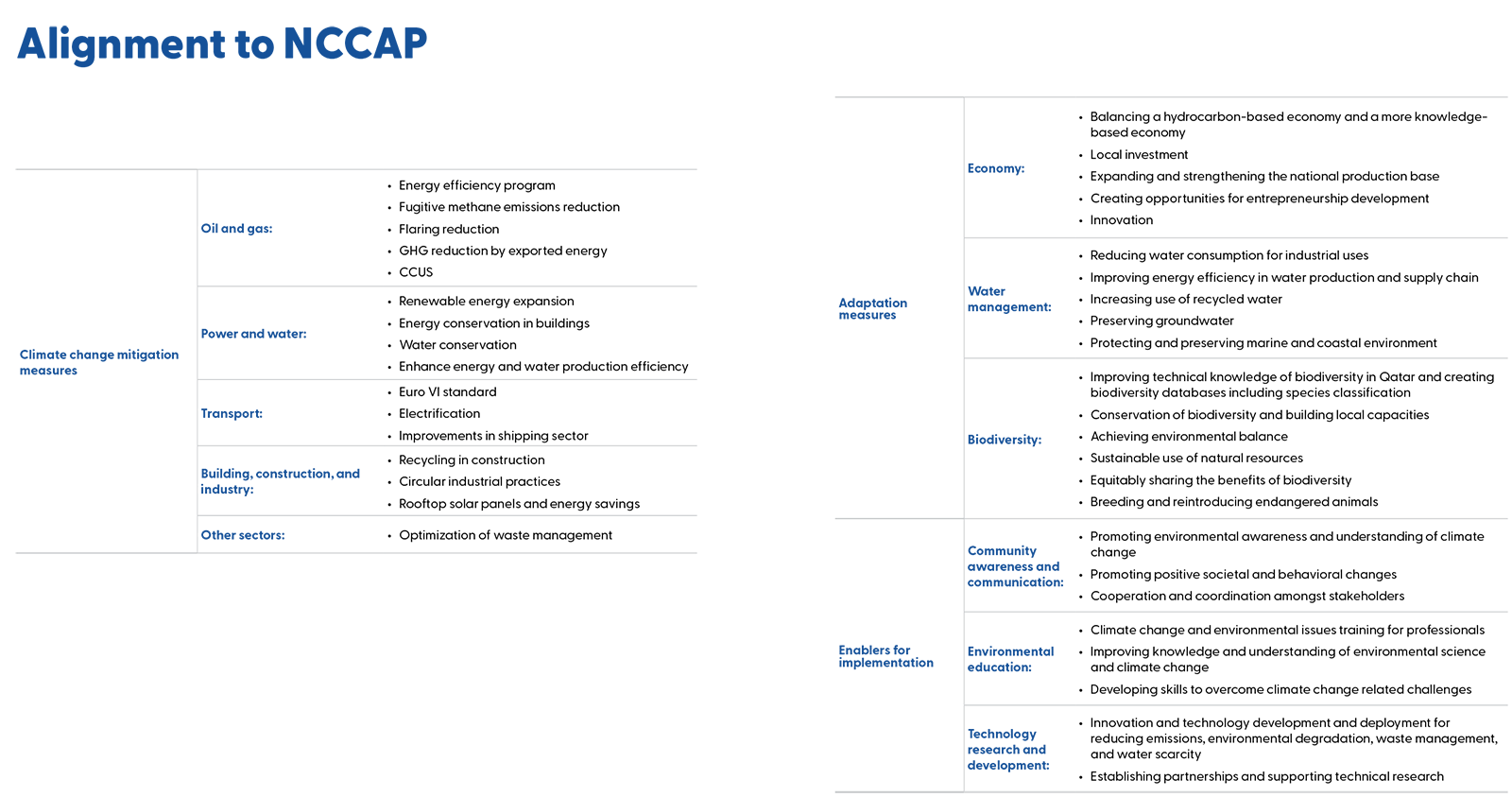 The following table highlights the mitigation measures, adaptation plans, and enablers relevant to QatarEnergy: