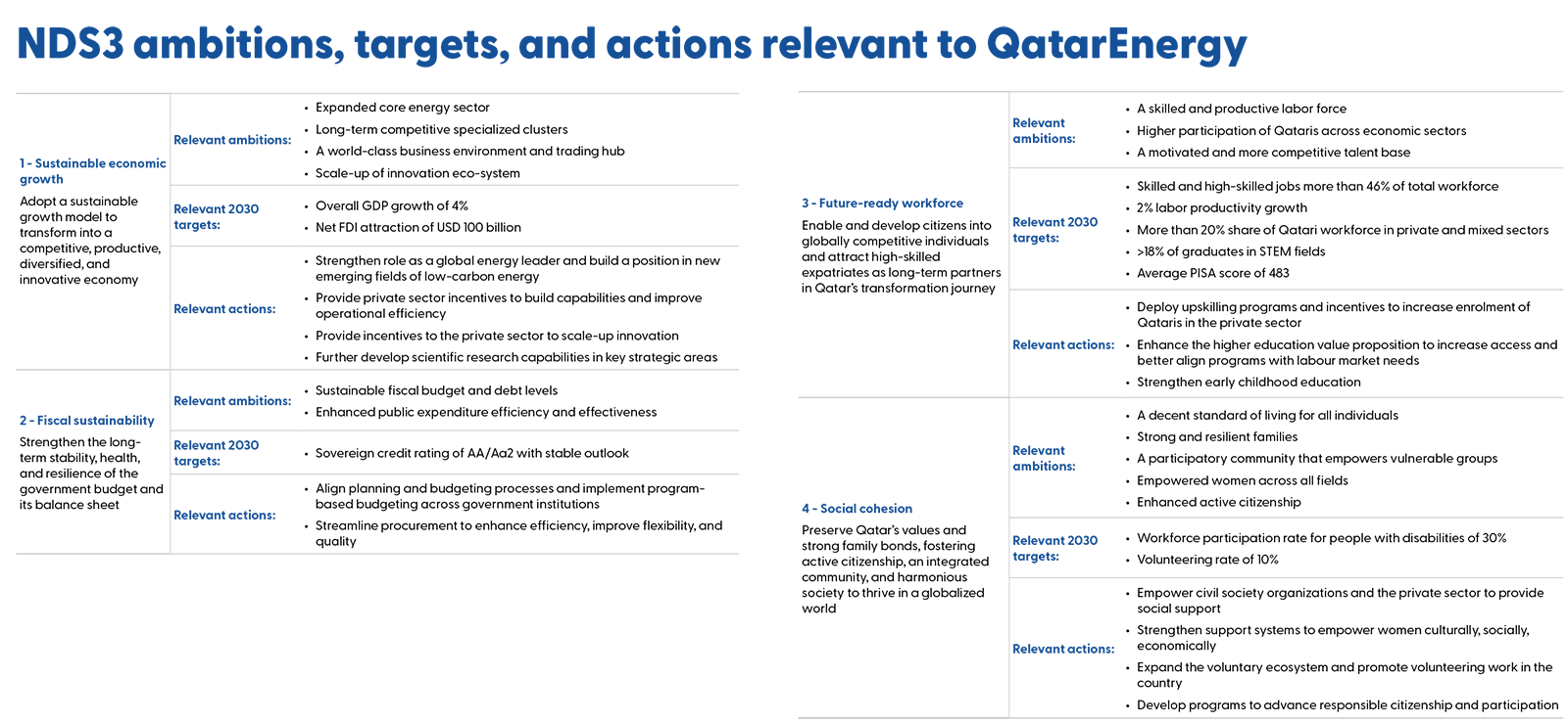 NDS3 is built around seven strategic national outcomes. Each strategic national outcome specifies Qatar’s ambitions and national targets for 2030 to achieve the ambitions. NDS3 also defines key actions required to be undertaken on a national level between 2024–2030, which will support in meeting the set targets. The following table summarizes the ambitions, targets, and actions within NDS3 relevant to QatarEnergy.