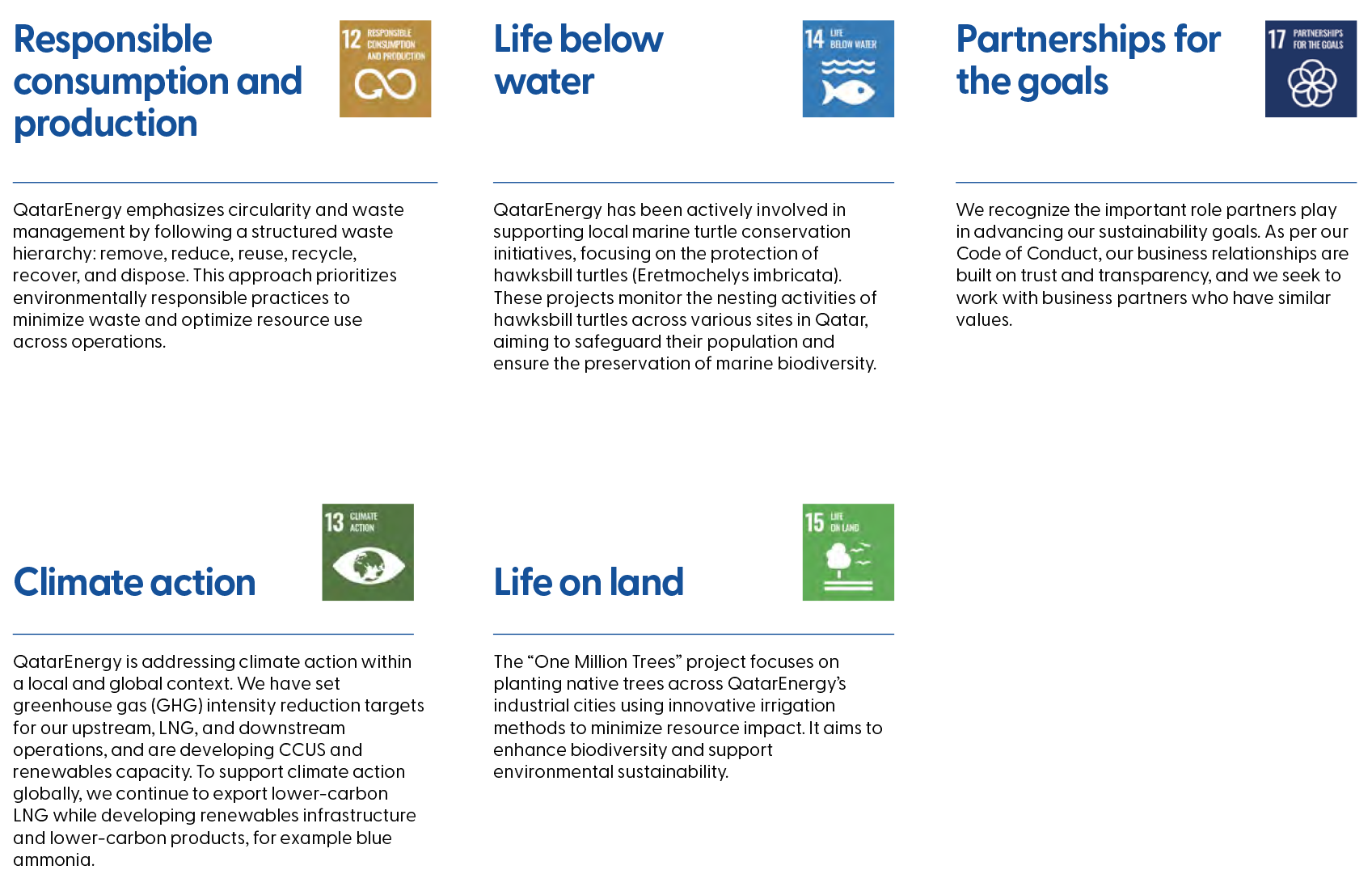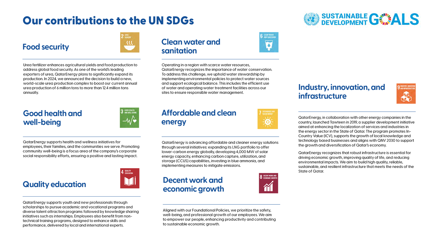 QatarEnergy aims to align its activities, operations, and sustainability contributions with the UN SDGs. While we contribute directly and indirectly to all SDGs, we address the ones that are most relevant to our business activities, focusing on areas where we can potentially have the greatest impact.